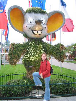 Hier seht ihr Andrea mit dem Maskottchen des Europa-Parks, der Euro-Maus.